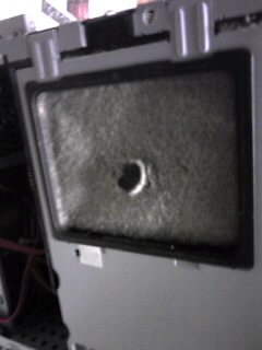 ……こりゃうるせぇわ。指で触ったところに穴が開いてるように見えるが、空けた瞬間は完全に埃でふさがれていました。購入から1年ちょっとでこんなにたまるとは。部屋が埃っぽいからなのか、それとも使ってる時間が多いからなのだろうか。