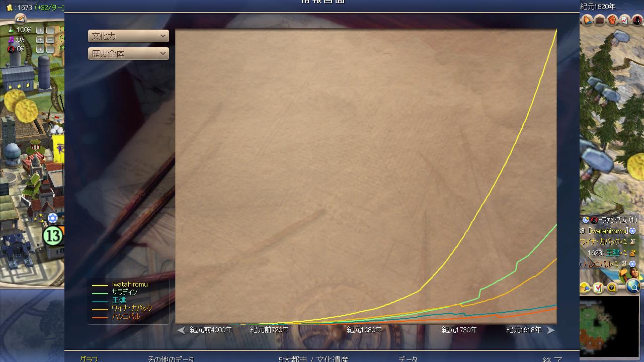 サラディンが朝鮮を食い物にし勢力を増大し始めたため、自分も文化力で前線を押し上げてカパックを攻撃。しかし、いつの間にかサラディンの属国になっていて攻略不能。カルタゴも朝鮮もサラディンの属国に。ロード。